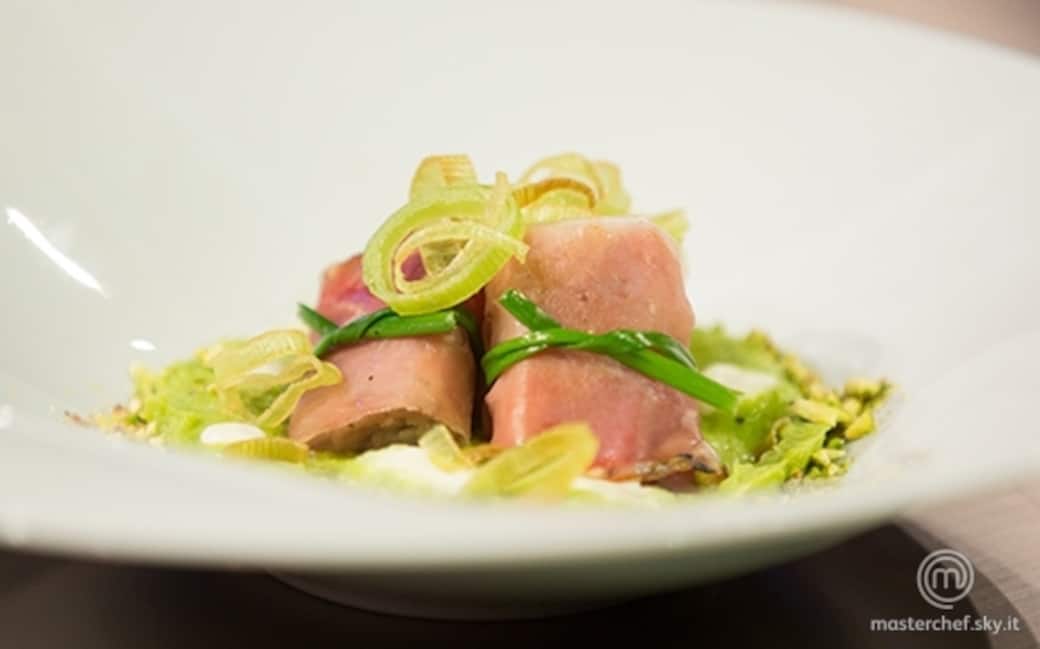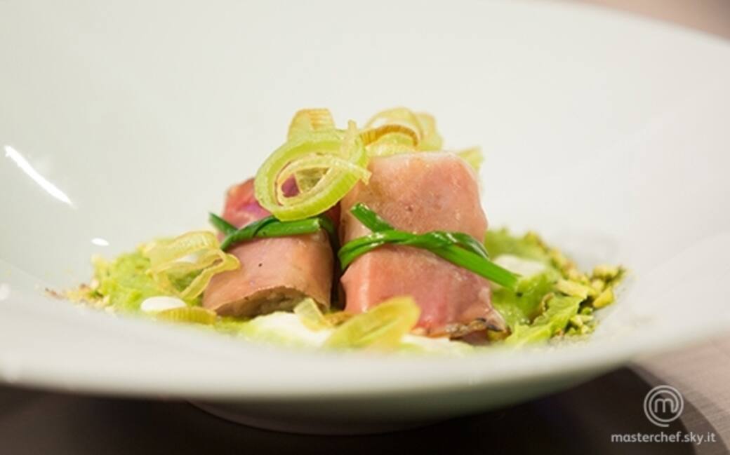 Comporre il piatto: posizionare la crema di piselli a specchio sul fondo del piatto, lasciare cadere alcune gocce di panna acida, adagiare successivamente i pacchetti al centro del piatto e il porro croccante a cascata; con i pistacchi tritati a coltello decorare il bordo della crema formando una specie di cornice.