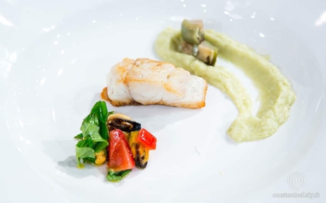 Impiattare con i tranci, la crema di melanzane a fianco, i carciofi saltati e le cozze.