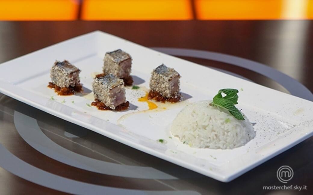 Dai filetti della palamita ricavare 4 cubi a persona e marinarli con il succo di 1 lime, zenzero grattugiato, pepe nero e olio. Dopo 10 minuti rosolarli in padella 10 secondi per lato, compreso quello della pelle. Aggiustare di sale.