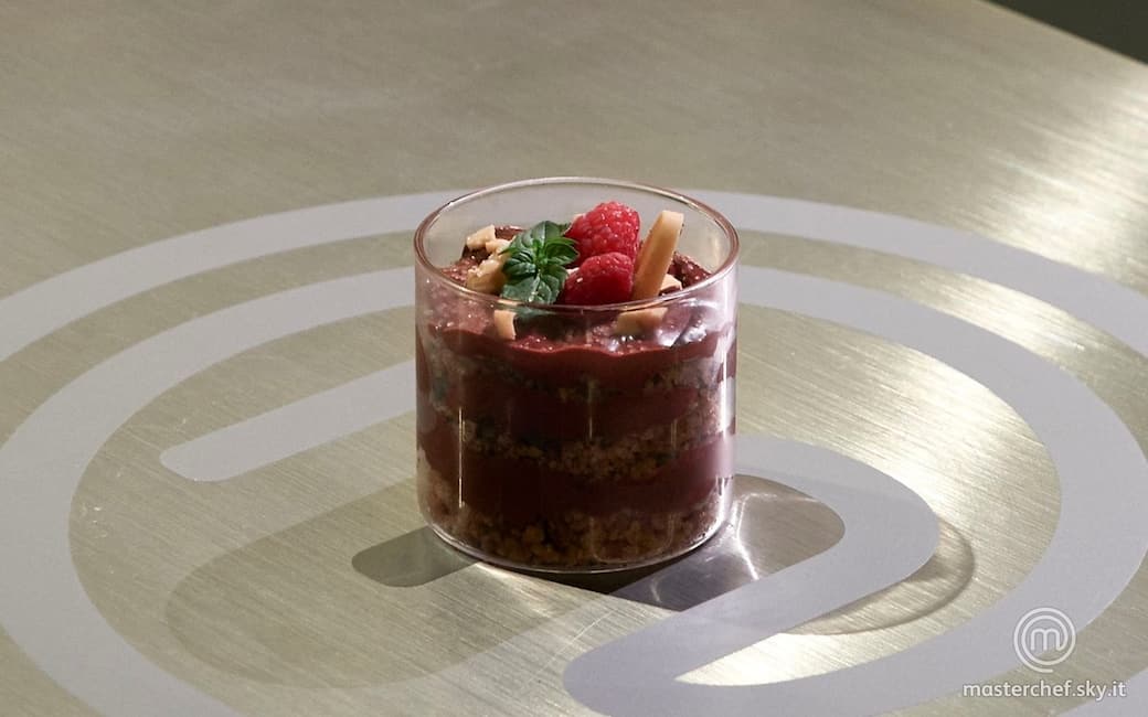 Impiattare la mousse in un bicchiere alternandola al crumble di pane. Decorare con scaglie di cioccolato bianco, lamponi e foglie di menta.