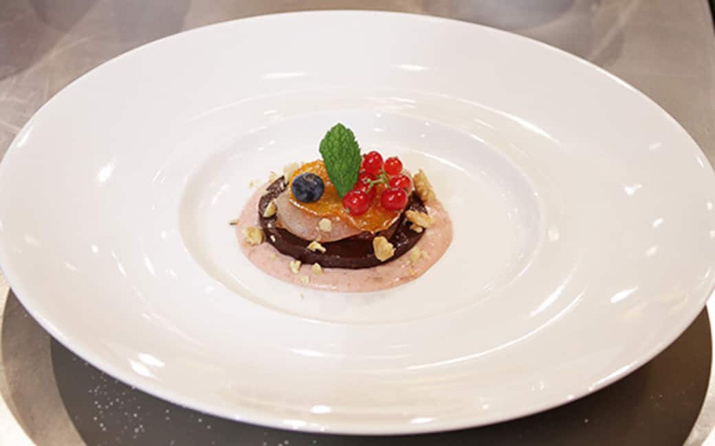 In un piatto creare una base circolare con la crema di panforte e frutti rossi. Adagiarvi un dischetto di cioccolato, un disco di crema di panforte e panna, un disco di cioccolato e per finire dei frutti rossi a bacche.