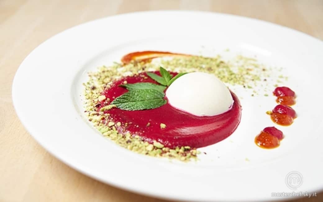 Stendere a specchio la crema di barbabietola (non tutta!). Appoggiare lateralmente la panna cotta, sullo specchio di barbabietola. Creare delle gocce di crema di pomodoro intorno al piatto. Creare delle gocce di crema di barbabietola. Spolverare il piatto con il trito di pistacchio. Aggiungere una foglia di menta in cima alla panna cotta.