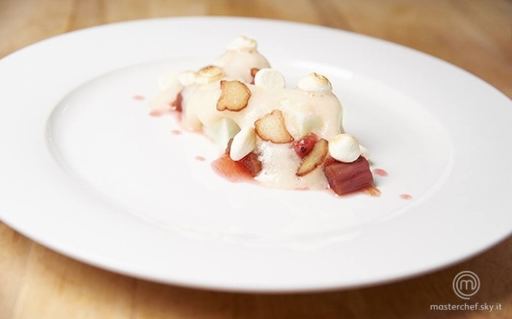 In un piatto piccolo e ovale mettere il semifreddo, poi fare delle puntine di salsa di rabarbaro, aggiungere il purè con il sifone, le meringhe sopra al purè e il rabarbaro tagliato sottile intorno al piatto.
