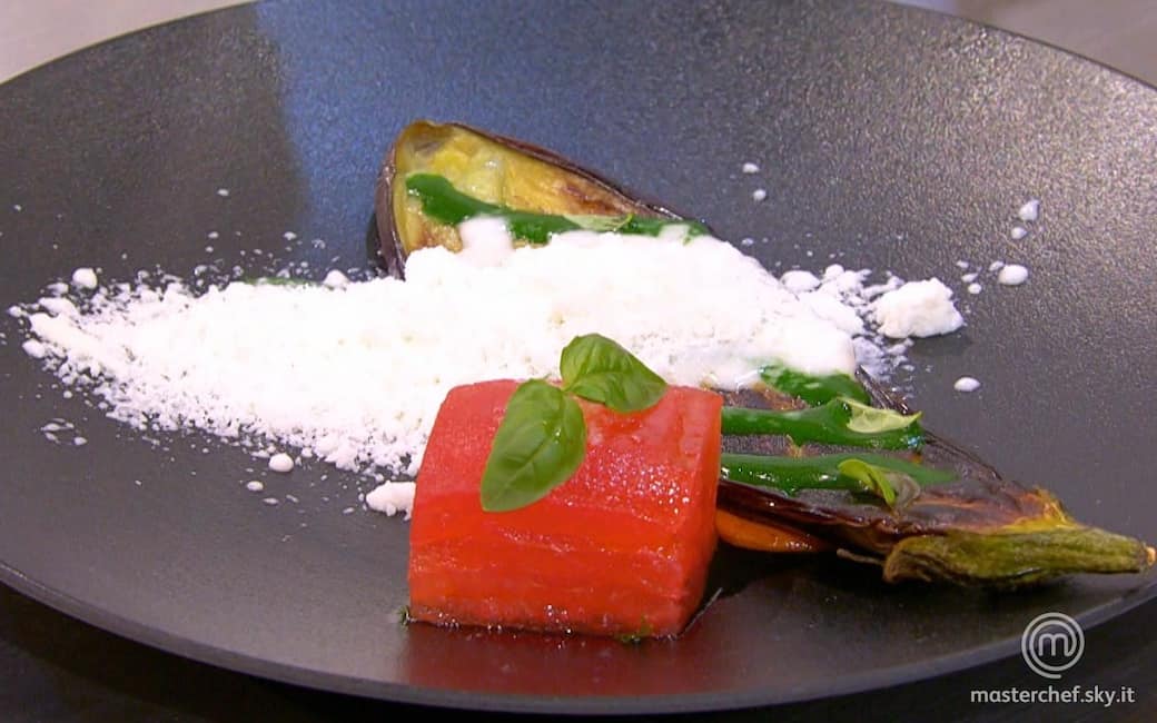 Centrifugare i 500 g di pomodori ramati, i ravanelli e il cetriolo per qualche minuto. Filtrare il liquido con un panno. Mettere i cubi di pomodori in un sacchetto per il sottovuoto, aggiungendo un po’ di scorza di limone grattugiata, menta, basilico e maggiorana e il centrifugato di pomodori. Mettere sottovuoto per 4 volte: per osmosi il succo entrerà all’interno del pomodoro.