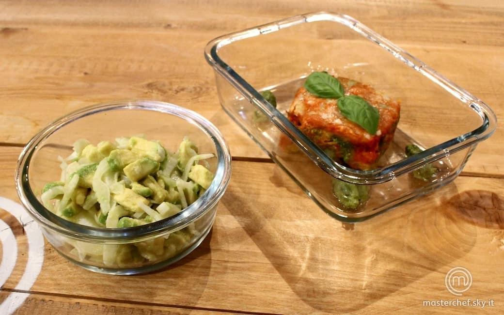 Sfornare il tortino di pomodoro e impiattarlo insieme al contorno nel lunch box.