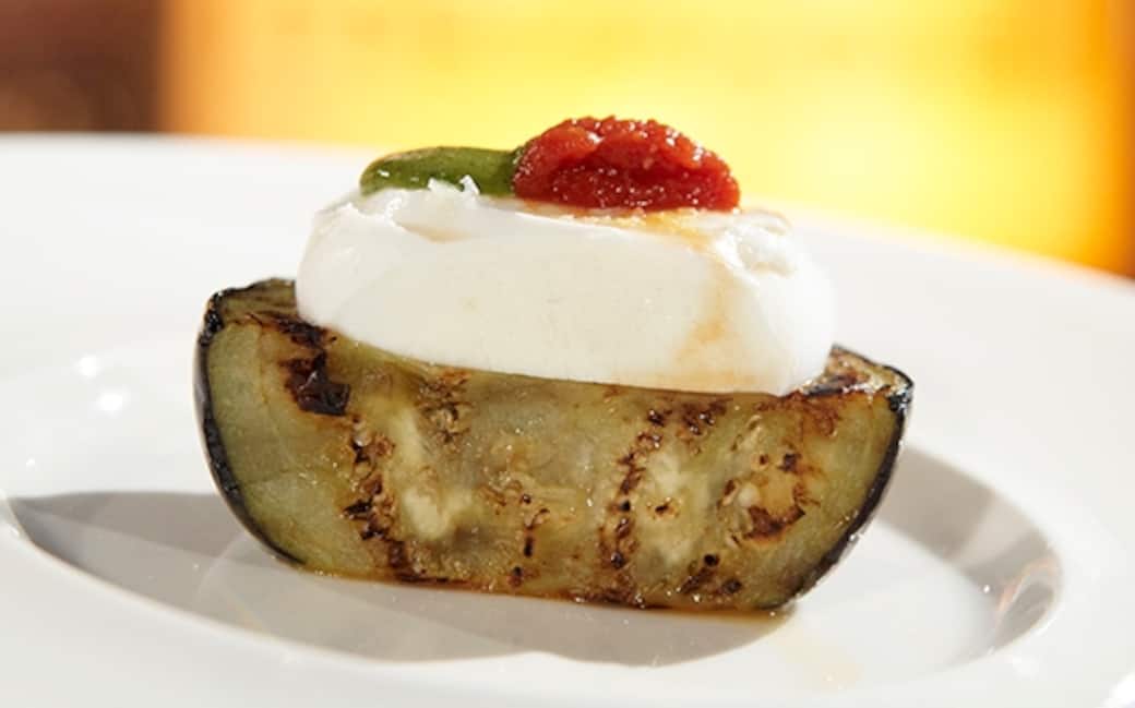Impiattare mettendo la melanzana sul fondo, la mozzarella tagliata a fette, una goccia di passata di pomodoro, un cucchiaio di pesto, qualche cristallo di sale maldon e olio.