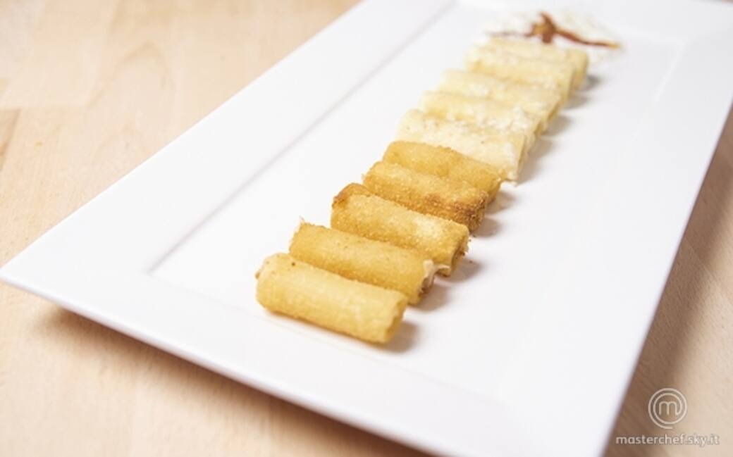 Spegnere il fuoco della pasta e ritirare solo 5 rigatoni arrivati a metà cottura. Lasciare gli altri nell’acqua. Riempire i 5 rigatoni con la crema al pecorino nella sac a poche. Impanare i rigatoni con il pangrattato. Friggere in abbondante olio d'arachidi.