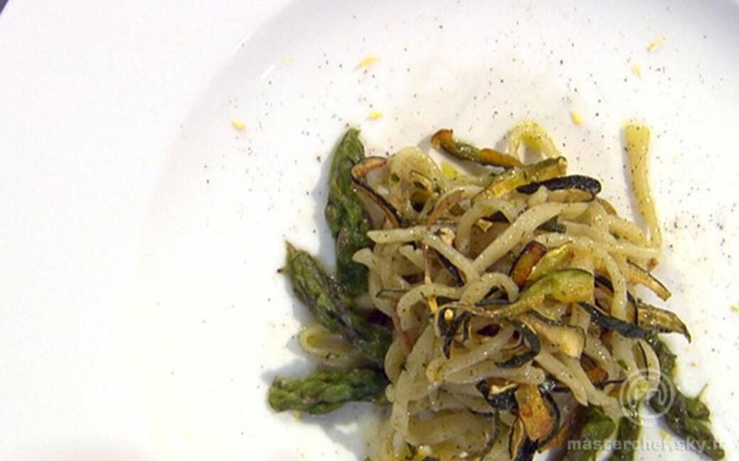 Stendere la pasta e tagliarla a listarelle che verranno poi arrotolate come uno spaghetto. Cuocere e condire con la salsa alle zucchine.