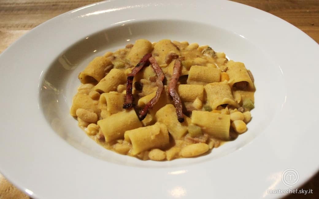 Impiattare pasta e fagioli decorando con un po’ di pancetta croccante.