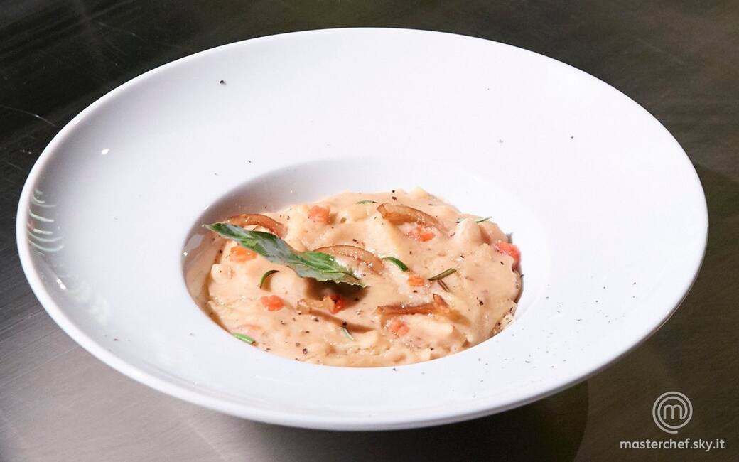 3. Cuocere la pasta nella crema di fagioli, allungando eventualmente con brodo vegetale. Tagliare a listarelle la cotenna rimasta, saltarla in padella e infornarla a 200 °C per 10 minuti.