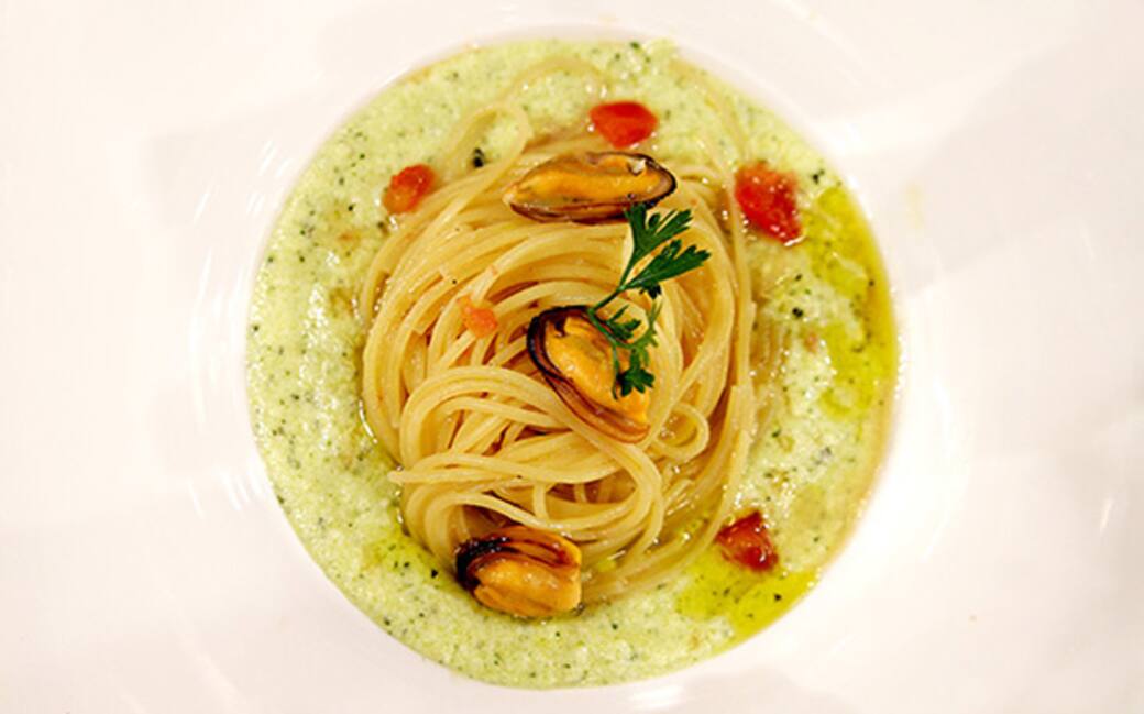 Saltare in olio le zucchine tagliate grossolanamente, cuocere velocemente e frullare insieme alla mozzarella e a poco zafferano creando una crema dalla giusta consistenza aiutandosi con un po’ di acqua di cozze.
