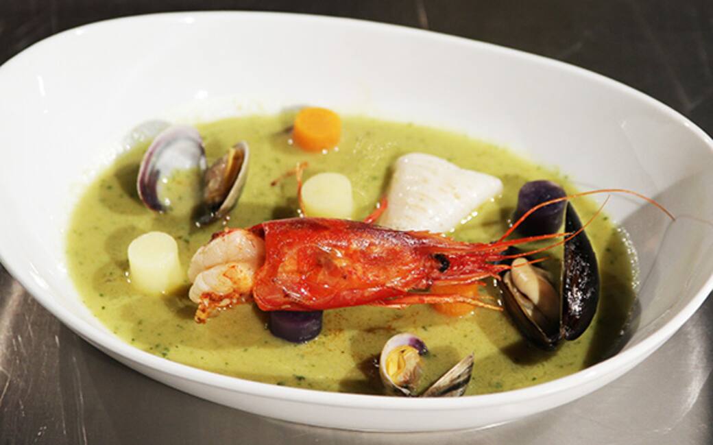In una padella tostare il curry, aggiungere l’olio e gli aromi frullati, il latte di cocco e l’acqua di cozze e vongole.