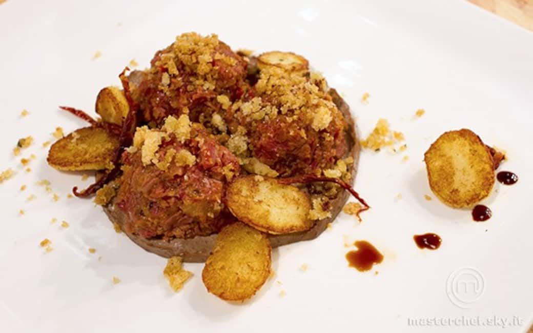 Impiattare disponendo al centro del piatto del paté di fegatini e adagiare sopra le polpette di carne e le patate con la crosta croccante. Finire con un giro di panure e un filo di aceto balsamico.