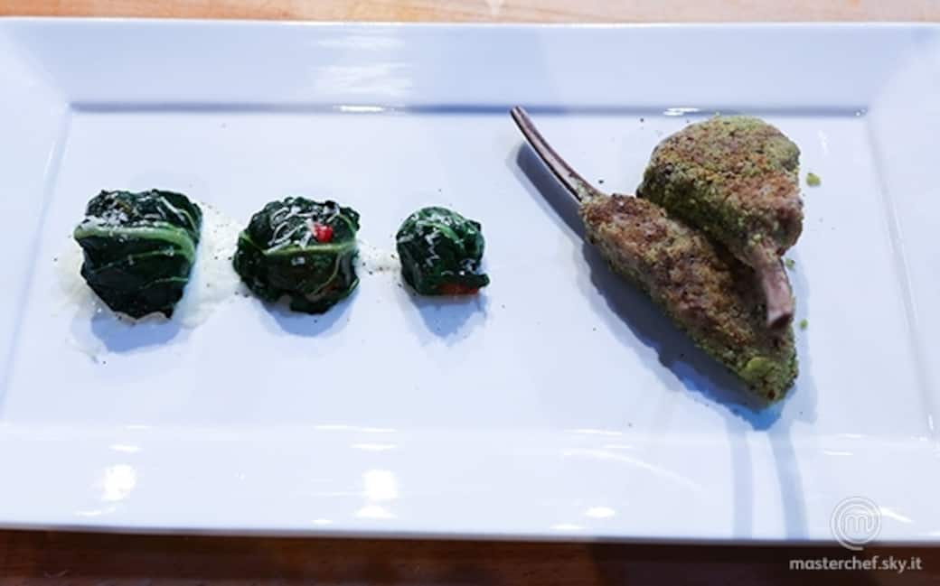 Tagliare il carré di agnello in modo da ottenere 4 costolette e farlo marinare in olio, aglio, timo e rosmarino. Lasciarlo riposare per circa 30 minuti. Sbollentare la bieta in acqua calda per circa 2 minuti e passarla in una bull con del ghiaccio per mantenere vivo il verde. Togliere la bieta dal ghiaccio e riporla nella carta assorbente. Passare al mixer i pistacchi e la farina e tritare il tutto. Aggiungere del sale e una macinata di pepe e mischiare con un cucchiaio.