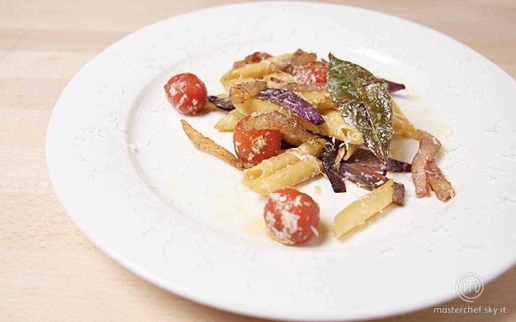 Penne rigate con cipolle di tropea, guanciale croccante e ricotta stagionata
