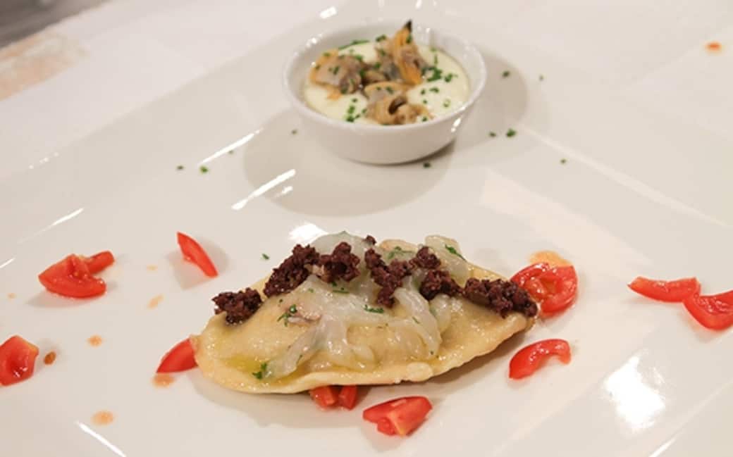 Per il raviolo, soffriggere cipolla, aglio, 4 o 5 capperi dissalati precedentemente e qualche foglia di dragoncello. Unire 50 gr di pomodorino spellato e tagliato a tocchetti. Far sciogliere il pomodoro e aggiungere la polpa della pesce, continuando la cottura per 5 minuti. Aggiustare di sale e spegnere il fuoco e versare il composto in un cutter per ottenere il ripieno. Tirare una sfoglia sottile con farina e uova. Spennellare con acqua la metà della sfoglia sulla quale porre le quenelle di ripieno e chiudere con l’altra. Ricavare dei ravioli con un coppapasta ovoidale, non prima di aver pressato gli estremi dello stesso per far aderire bene le 2 sfoglie sovrapposte.