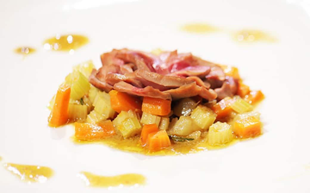 Impiattare disponendo una porzione di verdurine croccanti al centro del piatto e sistemandovi sopra i petali di rognone a rosa. Completare il piatto con un giro di salsa attorno.