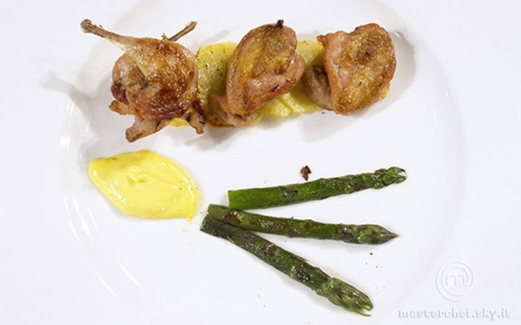 Impiattare disponendo alla base un letto di patate croccanti, appoggiarvi sopra due petti e due cosce di quaglia, mettere in parte gli asparagi e una quenelle di maionese.
