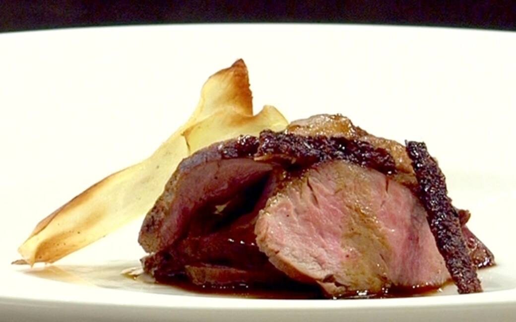 Servire il petto d’anatra tagliato al coltello in fette sottili sulle quali verserete la salsa a caffè, accompagnandolo con le sfoglie di patate e mezzo scalogno.