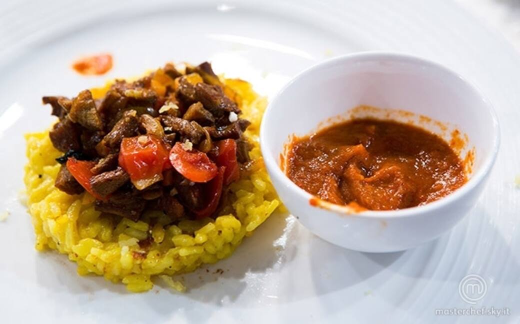 Una volta compattato, trasferire il riso su una teglia da forno in modalitá grill e cuocere per una decina di minuti fino a raggiungere la croccantezza.Tagliare la carne al coltello e amalgamare al fondo di cottura con pomodorini a brunoise e cipolle stufate. In ultimo aggiungere alla farcia il midollo.