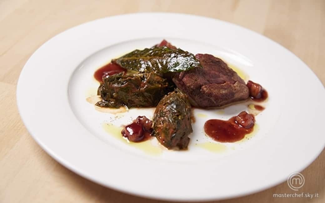Nella padella con la pancetta aggiungere la confettura ai frutti rossi, sfumare con un po’ di brandy e allungare con un po’ di fondo bruno. Filtrare la salsa con un colino a maglia fine. Togliere la cicoria dal forno.