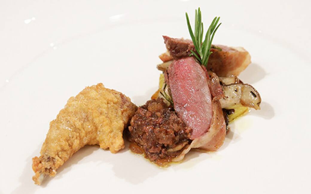 Dividere in due i petti di pollo, avvolgerli nella pancetta con un piccolo rametto di rosmarino, farli cuocere in poco olio, aglio con le frattaglie.