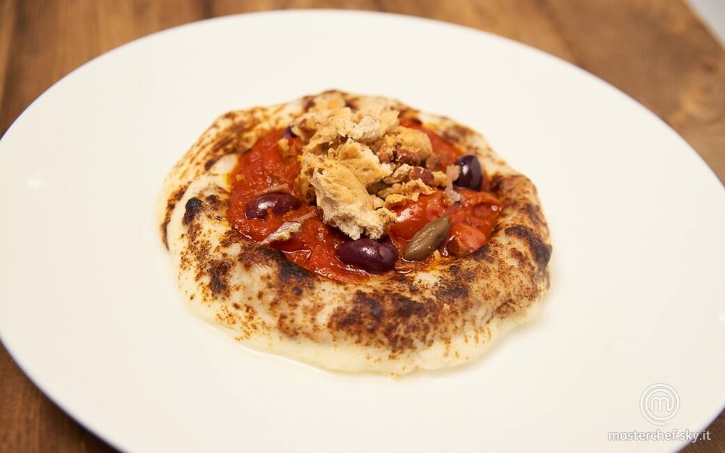 Pizza al contrario alla puttanesca con tarallo napoletano