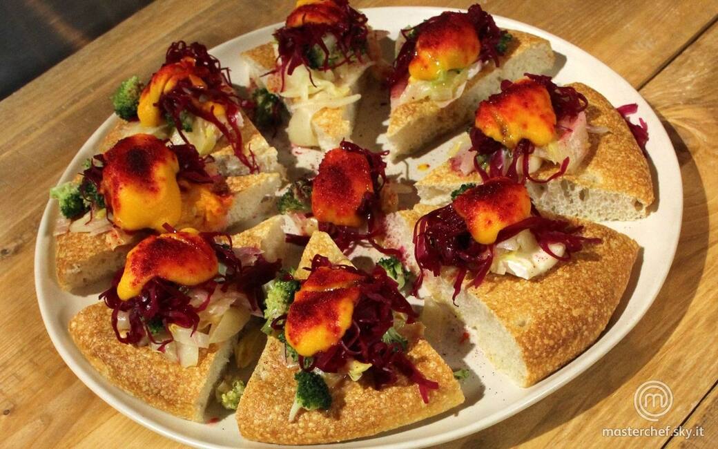 Sfornare la pizza, tagliarla e condirla con robiola di Roccaverano, indivia all’arancia, broccoli verdi, cavolo cappuccio viola, crema di carote allo zenzero e polvere di rape rosse.