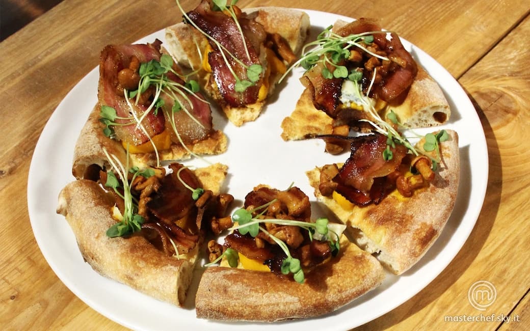 Pizza con pasta madre viva con finferli, crema di zucca e pancetta