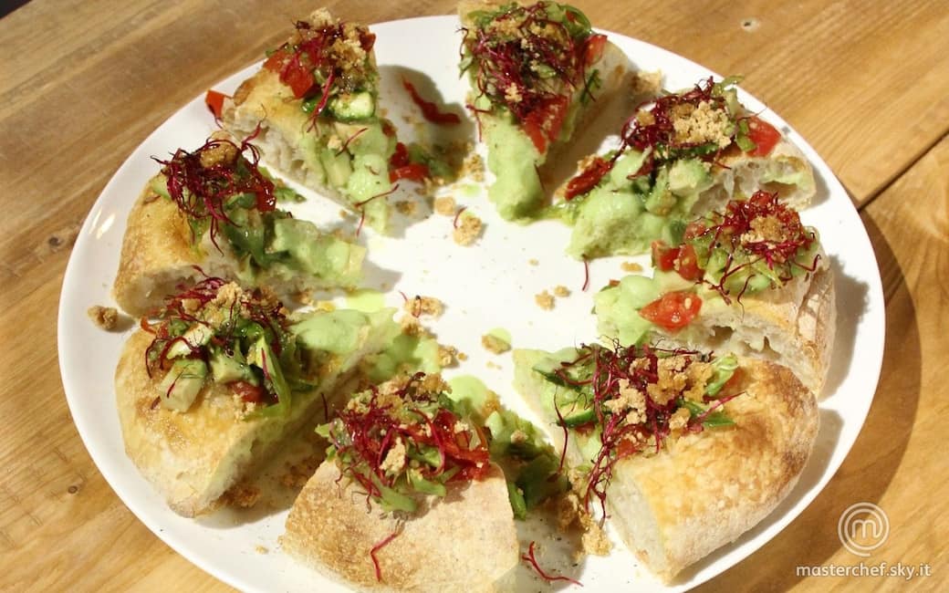 Lo chef prende la base della pizza già pronta e condisce la pizza: aggiungere prima la crema di asparagi, poi l’insalatina di avocado e infine l’insalatina di asparagi. Aggiungere il crumble di pane e terminare con i germogli di barbabietola.