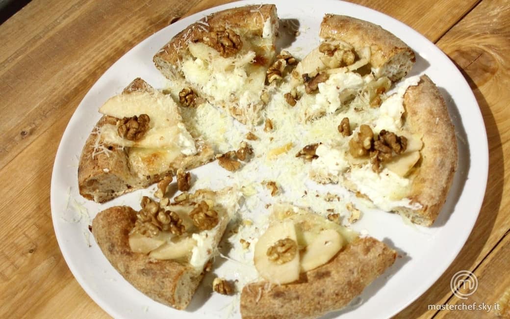 Pizza senza lieviti con mozzarella, miele di castagno e pere abate