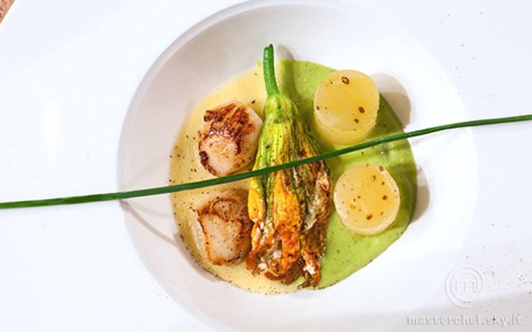 Impiattare in un piatto fondo: in una metà mettere lo zabaione di zucchine e sopra di esso i cilindri di patate affumicate. Nell’altra metà mettere la crema di burro e sopra le due capesante. Adagiare il fiore di zucca, precedentemente saltato in padella e farcito con la ricotta fra le due salse. Adagiare sopra al piatto un filo di erba cipollina.