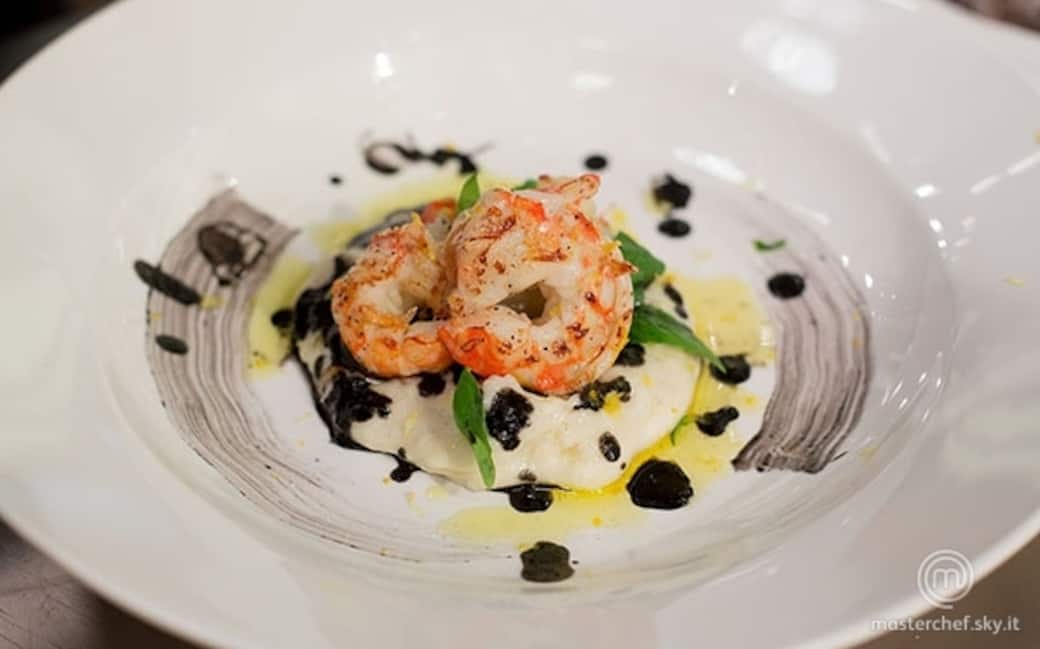 Soffriggere la cipolla bianca in poco olio, bagnare con il vino bianco e stufare, bagnando con il brodo di gamberi. Una volta cotta, versare due cucchiaini panna e ritirare subito dal fuoco. Frullare con un frullatore a immersione e aggiungere il nero di seppia diluito con poca acqua. Regolare di acidità se ce n’è bisogno con il succo di limone. Filtrare e tenere da parte.