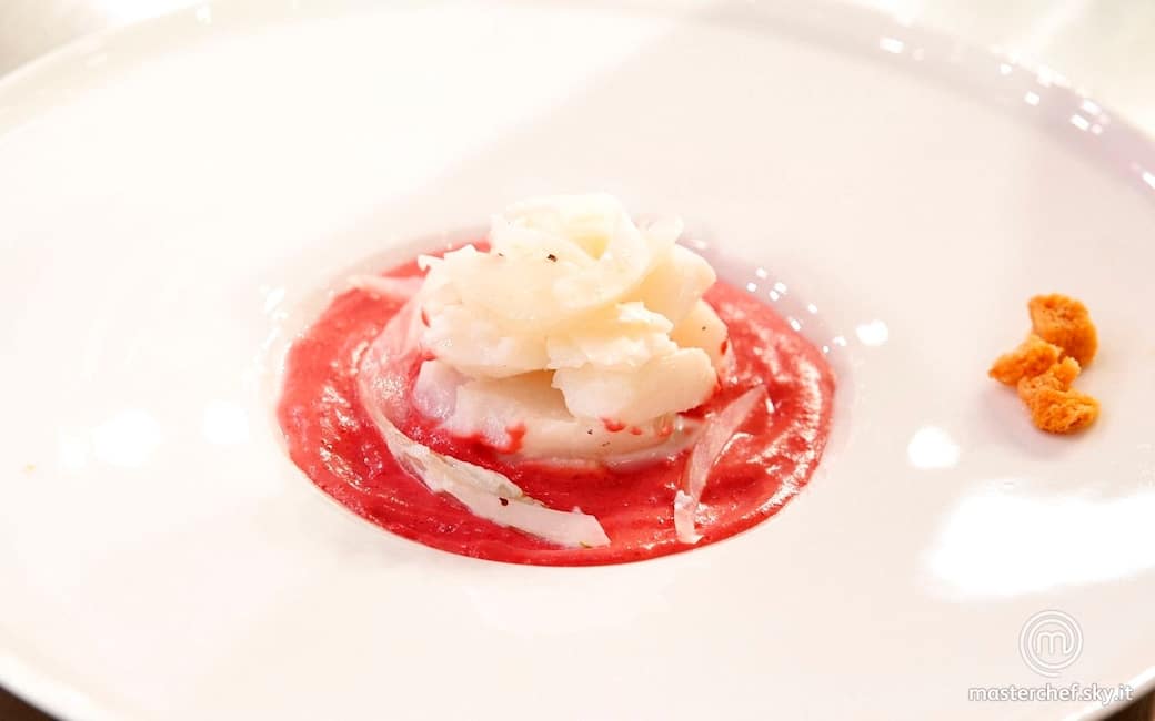 Per la crema di barbabietola mettere a bollire il riso con 2 cucchiai di panna; aggiungere la barbabietola a metà cottura, frullare, salare e setacciare.