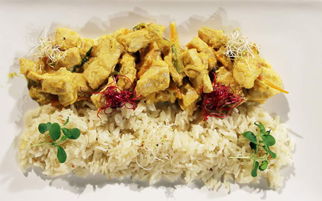 In una padella tostare la curcuma e il gran masala in olio e burro, aggiungere il pollo e far rosolare sfumando con vino bianco, poi metterlo da parte.