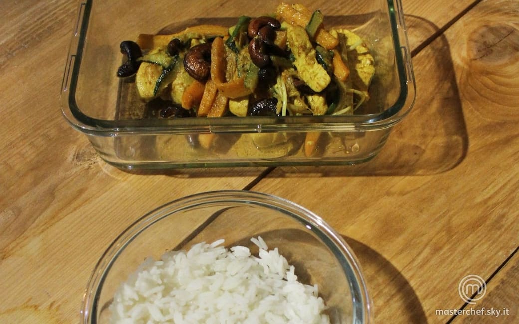 Riporre il riso in un contenitore e il pollo in un altro contenitore medio in modo da mantenere le verdure e gli anacardi croccanti.