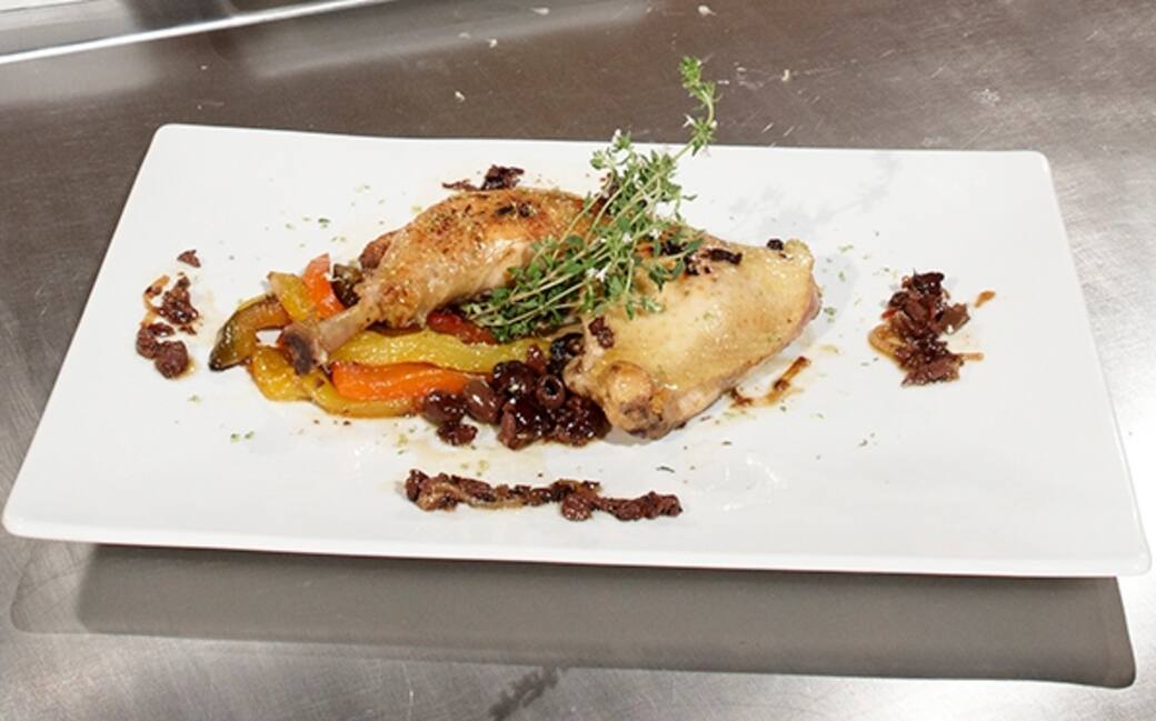 In un ampia padella scaldare l’olio e la cipolla rossa, aggiungere i quarti di pollo, il timo e l’aglio camiciato. Lasciare cuocere a fuoco vivace per 30’. Sfumare con del vino bianco; quando il vino bianco sarà sfumato e il fondo di cottura si sarà ritirato aggiungere i peperoni e le olive taggiasche tritate. Continuare la cottura per alcuni minuti, aggiustare di sale ed aggiungere la scorza di lime grattugiata.
