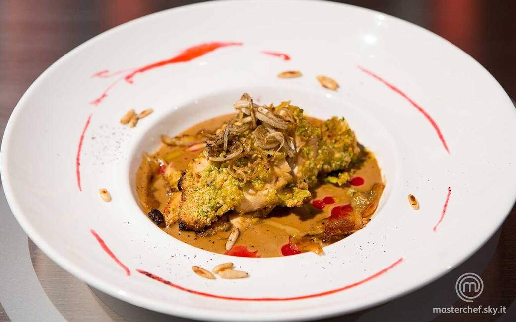 Scaldare poco olio in un tegame e adagiarvi il pollo per qualche secondo, rigirandolo. Toglierlo dal fuoco, asciugarlo bene, infarinarlo, passarlo nell’uovo sbattuto e in un trito di pinoli, pistacchi e anacardi. Ripiegare ogni petto di pollo su se stesso mettendo un paio di pinoli interi nel mezzo. Cuocere in forno a 200 °C per 20 minuti.