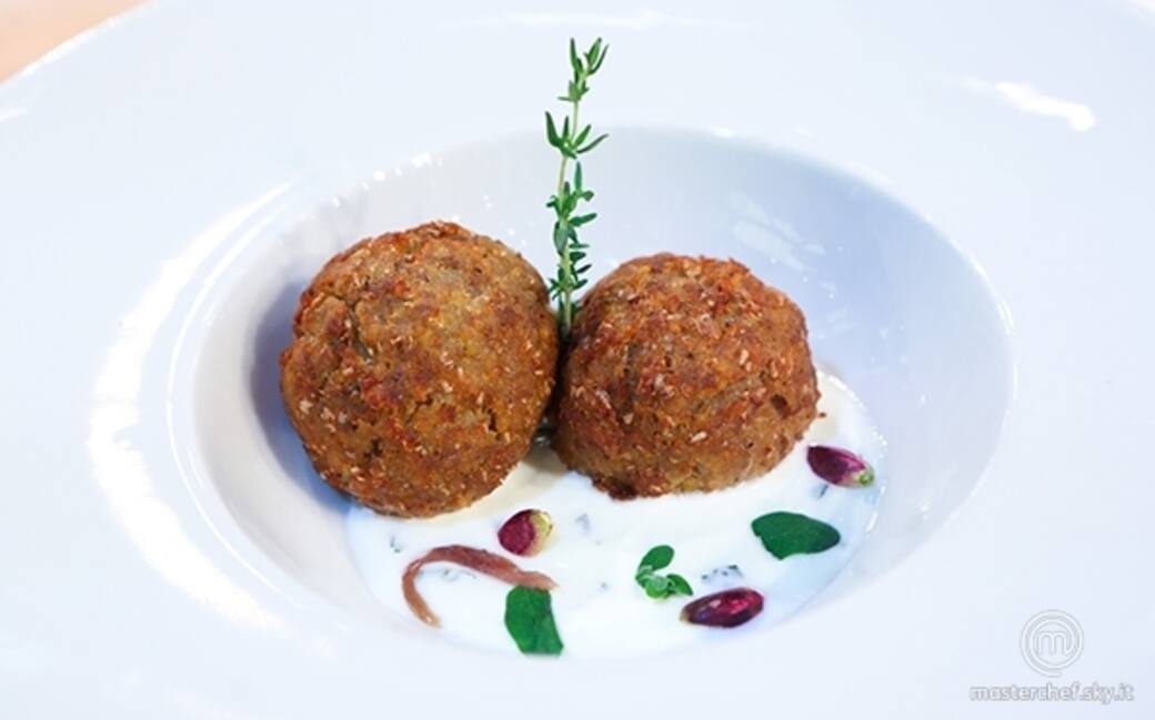 Polpette di cicerchie e agnello ripieni di erbe con salsa di yogurt