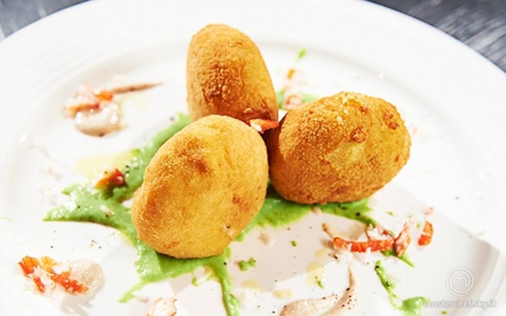 Polpette di granseola con passata di piselli ed emulsione di acciughe