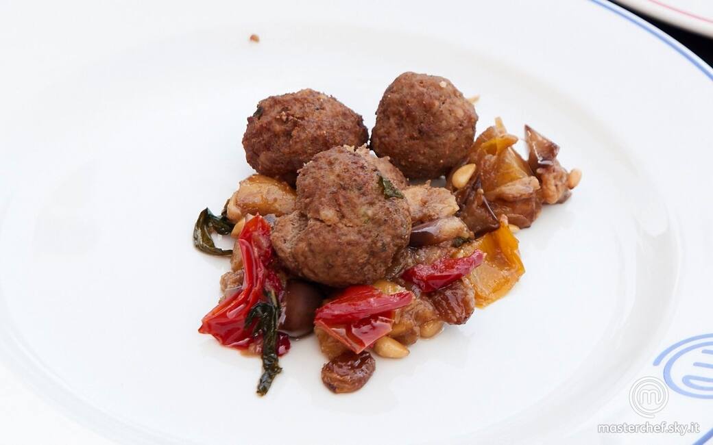 Servire le polpette con la caponata di verdure. Aggiustare di sale e pepe.
