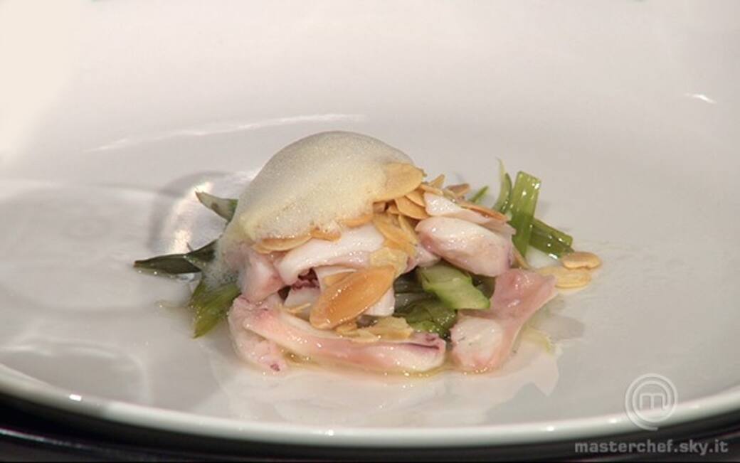 Aggiungere qualche goccia di aceto di riso allo zenzero, aggiungere un cucchiaino di lamella di mandorle tostate. Salare la soluzione di acqua e aceto di riso allo zenzero, aggiungere mezzo cucchiaino di lecitina di soia, portare la soluzione a 40° e, con l’aiuto di un mixer a immersione, creare una schiuma ben ferma. Disporre due cucchiaini di spuma sulla preparazione.