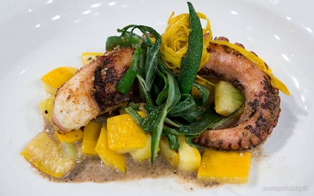 Impiattare la zuppa e le aragostelle, adagiarvi le verdure intorno e disporvi sopra i tentacoli del polpo e il frutto della passione.