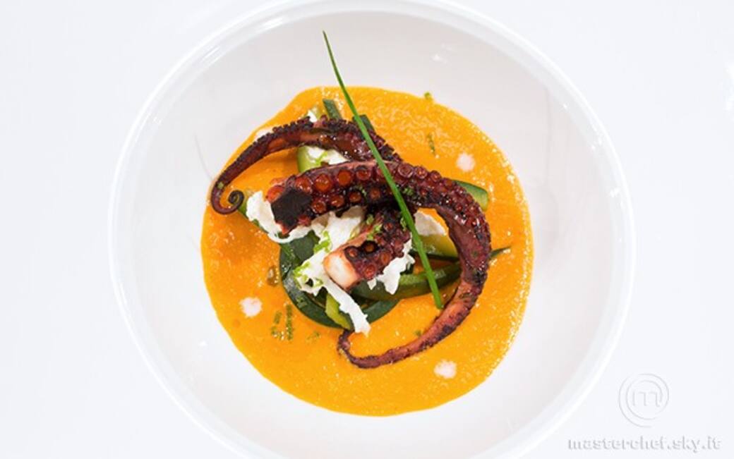 Tagliare i tentacoli dal corpo del polpo cotto e piastrarli in padella molto calda per renderli croccanti. Comporre il piatto e finire con un goccio di olio evo.