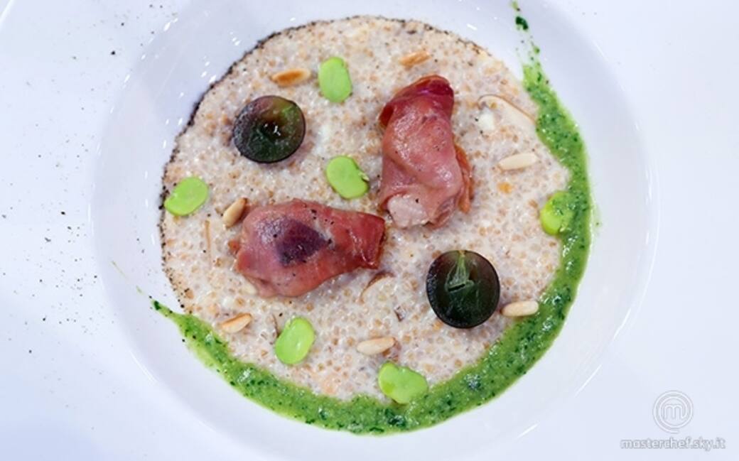 In una fondina di media larghezza impiattare il porridge, aggiungere due pezzi di quaglia e guarnire con la salsa di fave, qualche fava cruda, i pinoli tostati e l'uva tagliata a metà e girata al contrario. Terminare con abbondante pepe nero appena macinato.