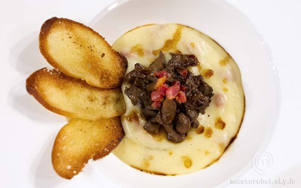 Impiattare in una fondina mettendo alla base la crema di patate, sopra due cucchiai di fegatini all’aceto balsamico, qualche pezzettino di pancetta croccante, la salsa all’aceto e tre fettine di pane al forno.