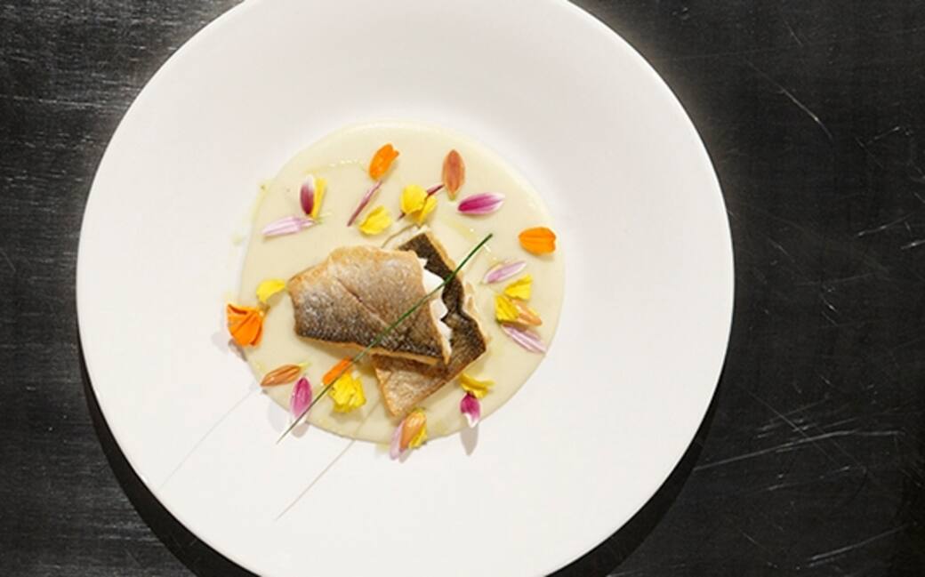 Scolare il branzino e inciderlo dalla parte della pelle. In una padella scottare i filetti a fiamma alta, prima dalla parte della pelle, poi da quella della polpa. Salare e pepare.