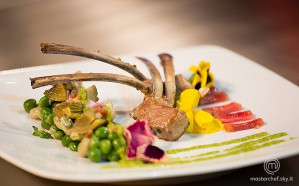 Comporre il piatto con la vignarola, le costolette, il timo, la crema di lattuga, il rabarbaro, i fiori di erba cipollina e i fiori eduli.