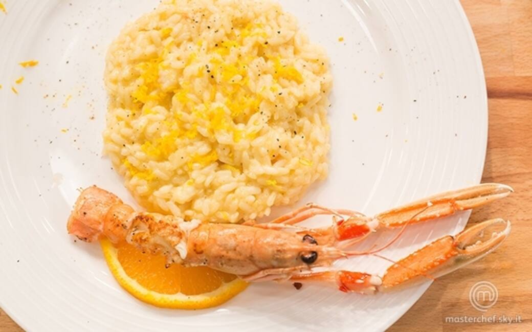 A 5 minuti dalla fine della cottura, aggiungere gli scampi tagliati e rosolati in padella con lo scalogno e un filo d’olio. Aggiungere il succo di arancia, salare e pepare.