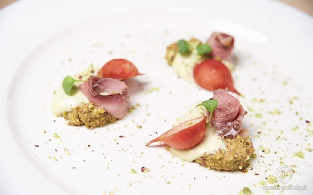 Prosciutto d’anatra, salsa di pistacchio, crema di blu di capra e rapanello in agro